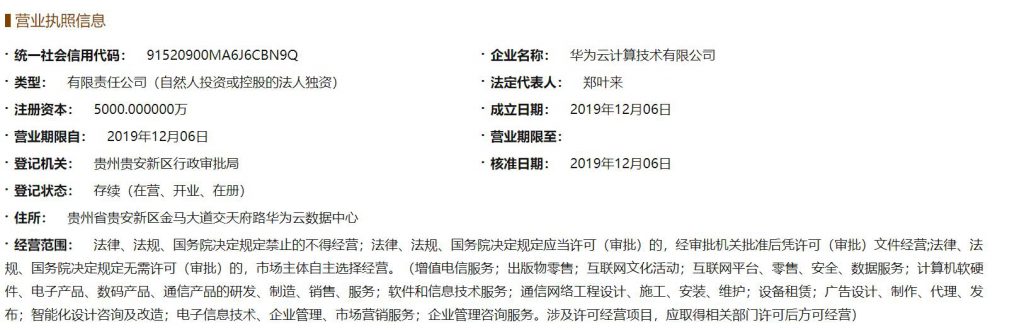 根据企业信息公示系统的信息显示,华为于12月6日在贵州获批成立了“华为云计算技术有限公司”,注册资本5000万。