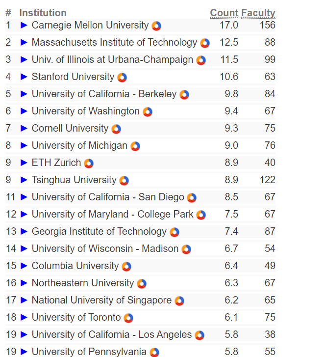 图注:CS Ranking上排名前20的高校(所有计算机领域,以2010-2020年之间的数据为准)