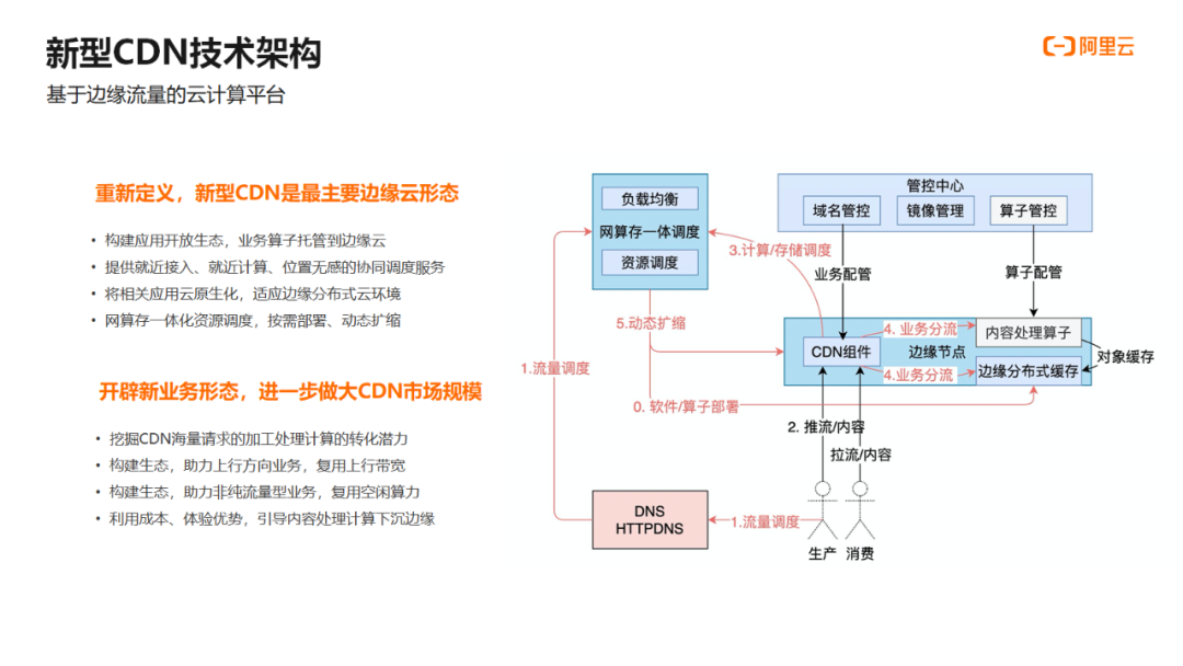 在谈到新型CDN概念时,李忠仁表示:CDN由传统的内容分发, 转变成带宽、算力、存储等多维的分发。CDN的技术底座已向边缘云操作系统演进, 传统CDN只是边缘云上的一个应用, 其消耗的主要是带宽, 此外还会有很多消耗算力和存储的应用运行在这个边缘云操作系统上。阿里云提供了底层操作系统, 用户可以根据自己的业务情况,构造自己的算子并托管到阿里云边缘云节点上。阿里云面向给用户提供就近接入、就近计算、位置无感、按需部署、弹性伸缩的自动化云服务。而这种新型的业务形态实现和传统的CDN优势互补,不仅复用CDN的上行带宽、闲散算力,还给用户提供延时更小、成本更优的服务。
