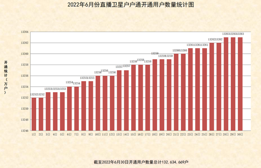 7月4日,国家广播电视总局卫星直播中心公示了2022年6月份直播卫星户户通开通用户数量统计图。