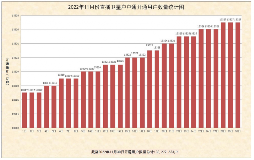 12月5日,国家广播电视总局卫星直播中心发布了2022年11月份直播卫星户户通开通用户数量统计图。