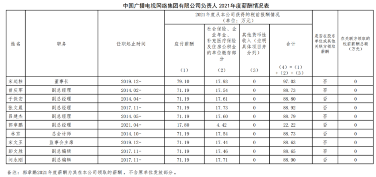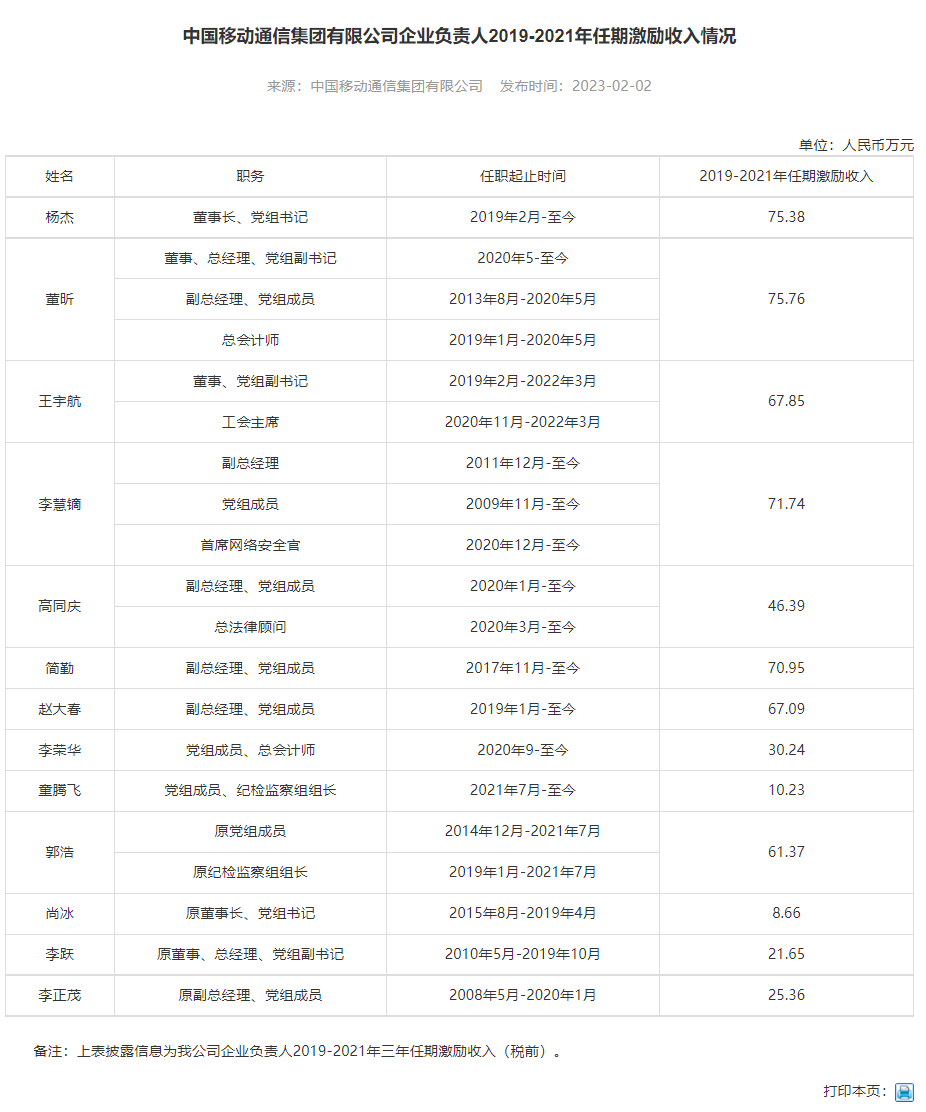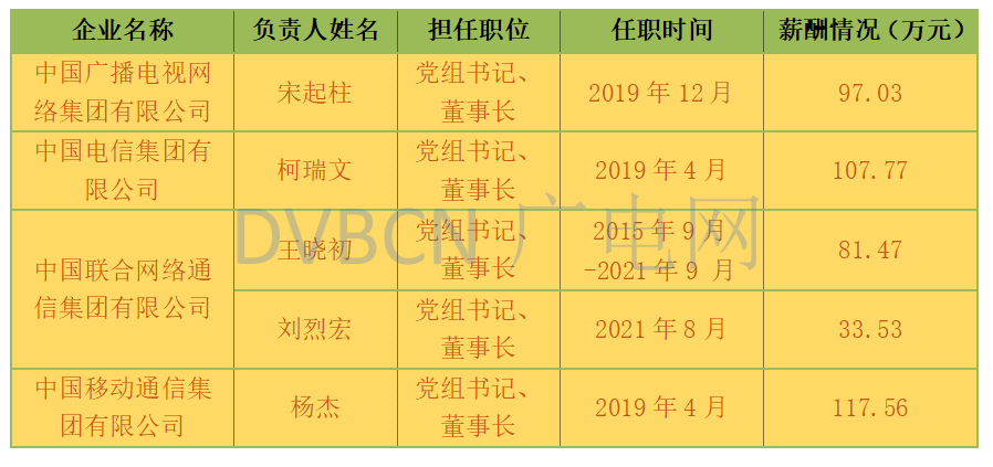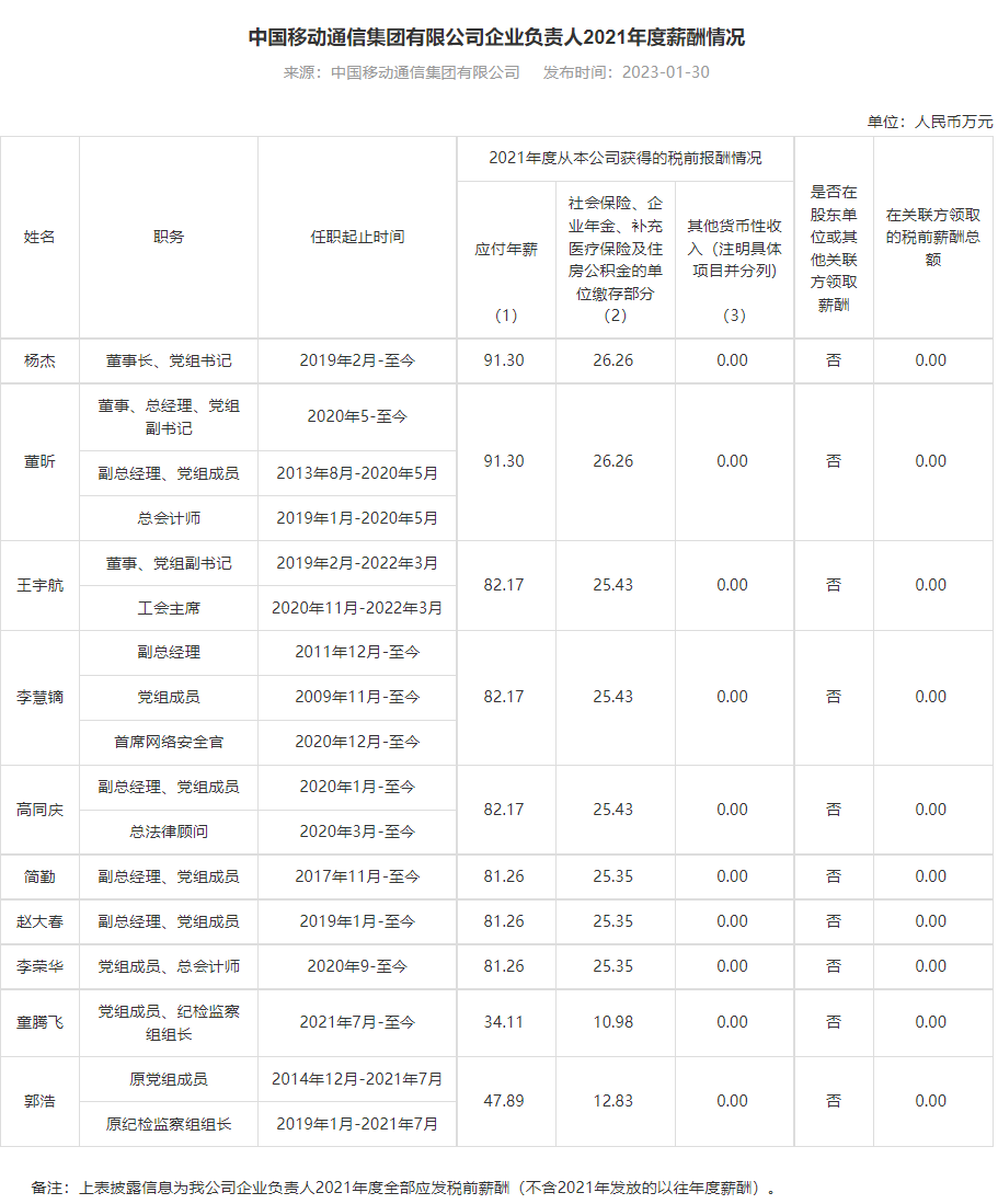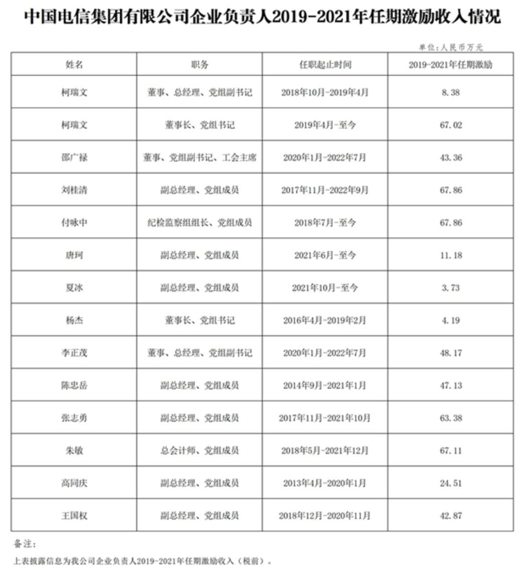 四大运营商董事长及其他负责人2021年度薪酬一览