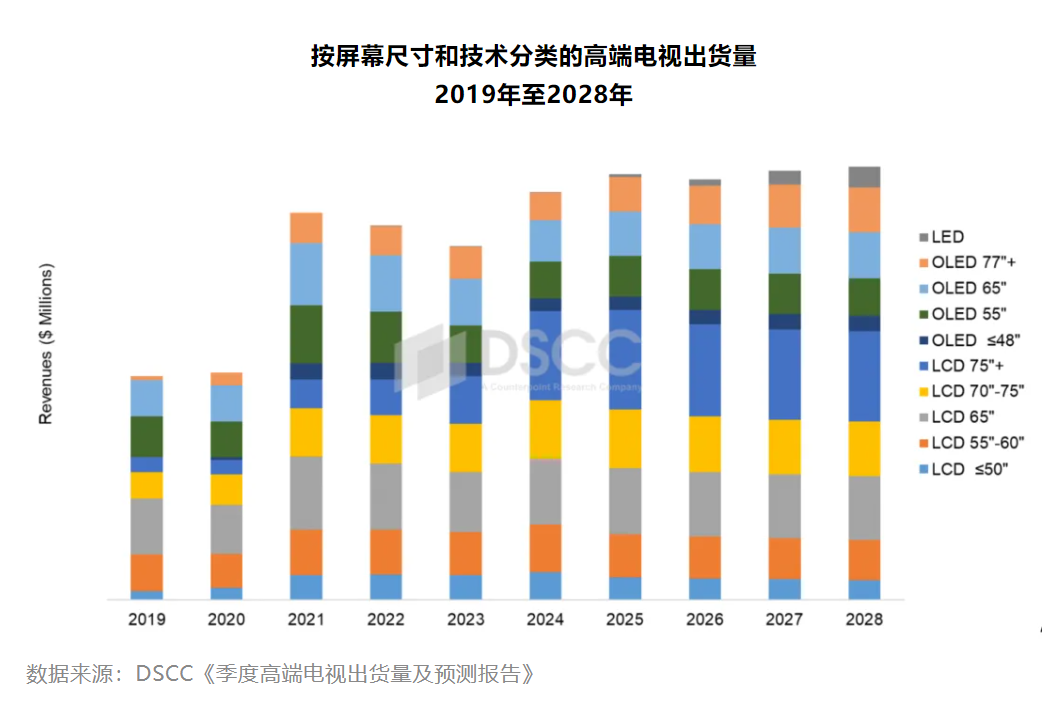 根据DSCC最新发布的季度高端电视出货量及预测报告,2023年高端电视出货量和收入均有所下降,但自2024年第一季度起开始复苏,第二季度加速增长,并将持续强劲至2024年全年,预计增长势头将延续至2028年。