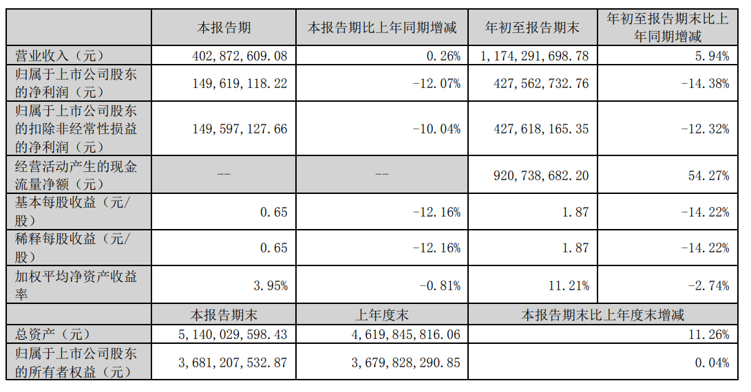 前三季度实现营收11.74亿元,同比增长了5.94%;归属于上市公司股东的净利润为4.28亿元,同比减少了14.38%。