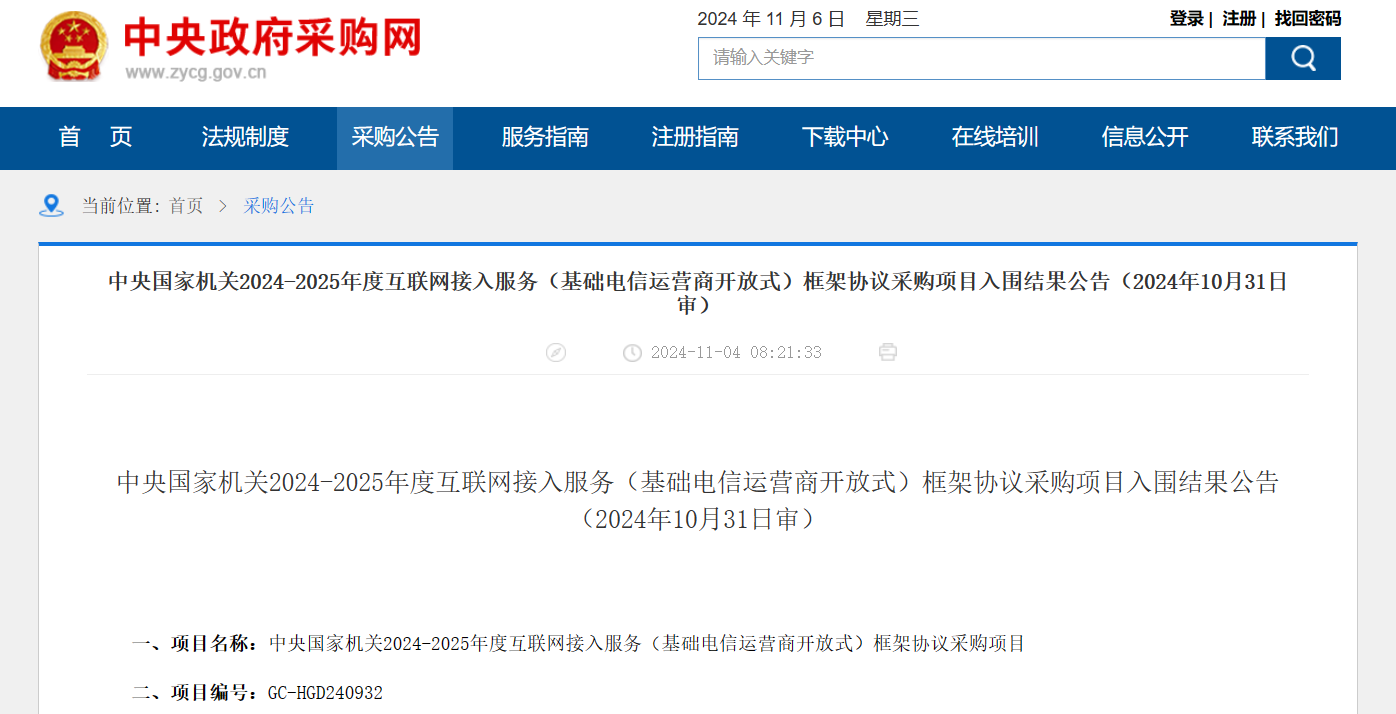 11月4日,中央国家机关政府采购中心公布了中央国家机关2024-2025年度互联网接入服务(基础电信运营商开放式)框架协议采购项目入围结果。