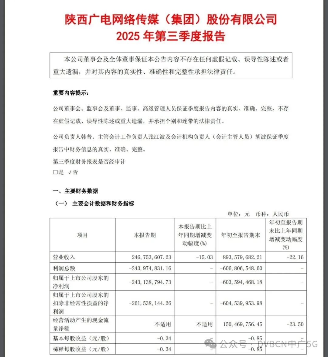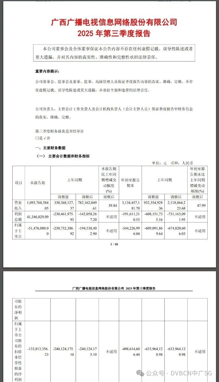 前三季度,广西广电网络实现营业总收入31.34亿元,同比增长47.99%;归母净利润亏损3.44亿元,上年同期亏损6.75亿元;扣非净利润亏损4.99亿元,上年同期亏损6.34亿元。