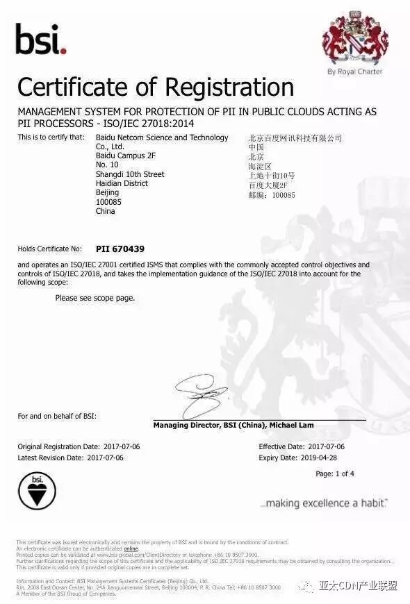 7月6日,英国标准协会(BSI)正式向百度云颁发了最新版ISO/IEC27018:2014国际认证,百度云成为国内首家获得此项证书的云服务供应商。