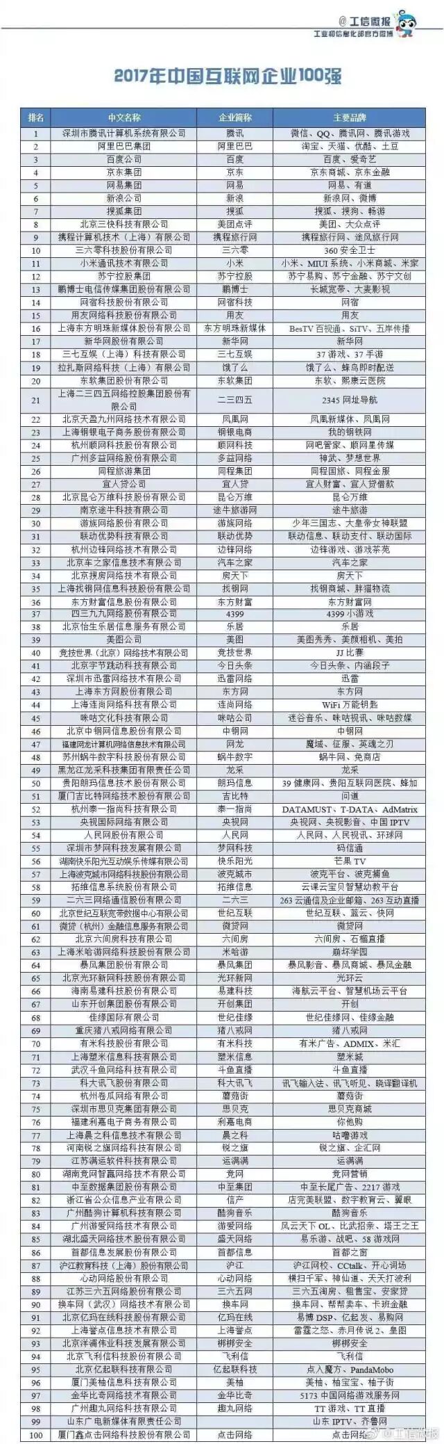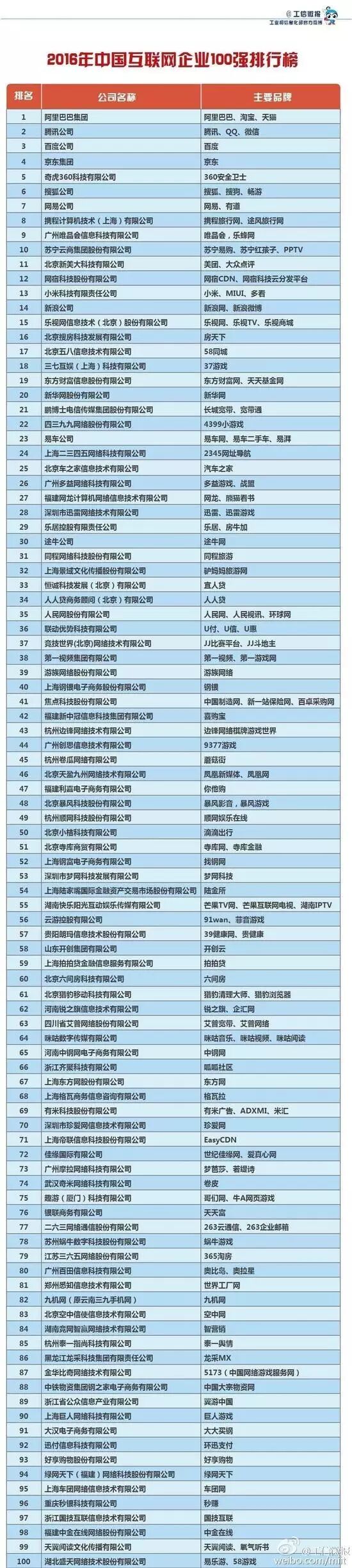 注:以下为2016年“中国互联网企业100强”,仅供参考。