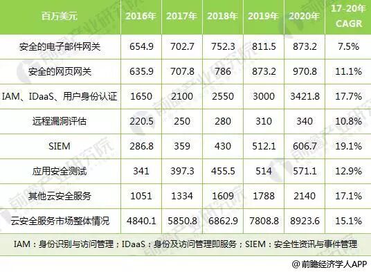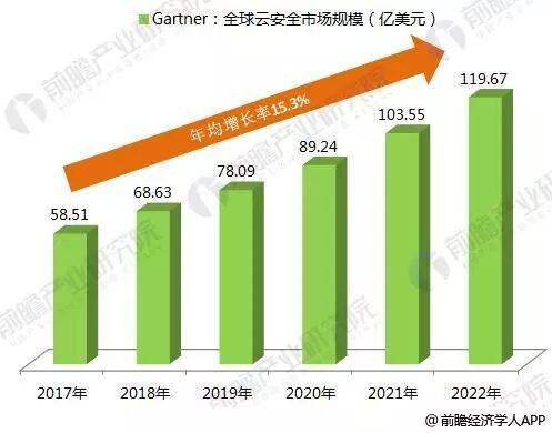 Gartner公司预计,随着越来越多的企业,尤其是中小企业采用云安全服务,云安全服务市场,包括安全邮件/web网关、身份和访问管理IAM、远程漏洞评估、安全信息和事件管理将迎来高速发展时期,到2022年,全球云安全服务市场规模将达到近120亿美元。