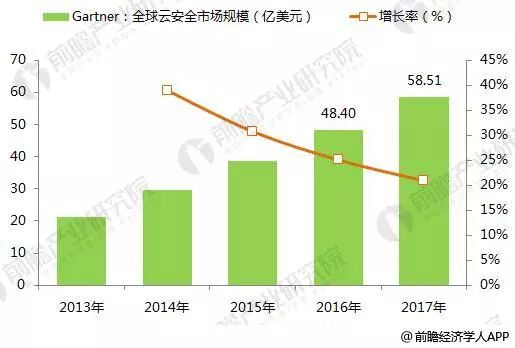 图表2:2013-2017年全球云安全市场规模增长情况(单位:亿美元,%)