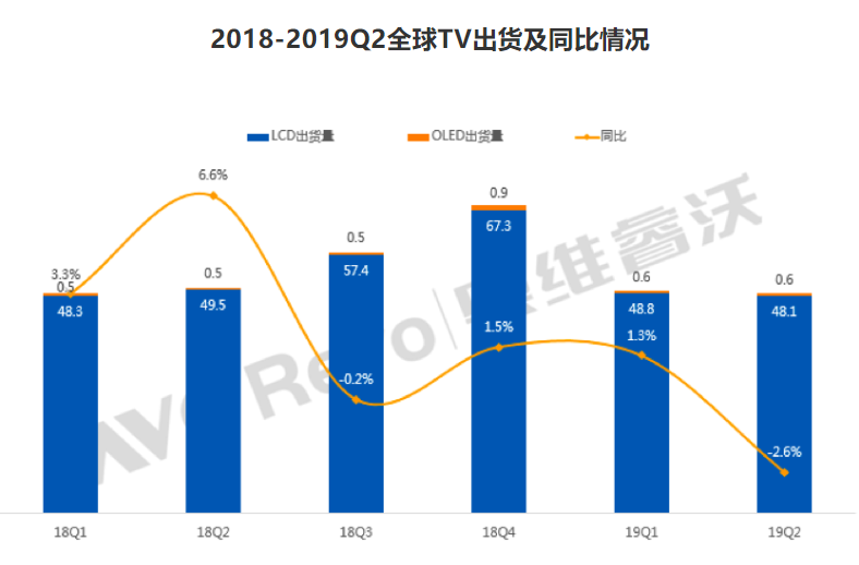 奥维睿沃预计,下半年全球经济低迷,全球TV出货增速受宏观经济影响将会放缓,2019年全球TV出货同比持平。