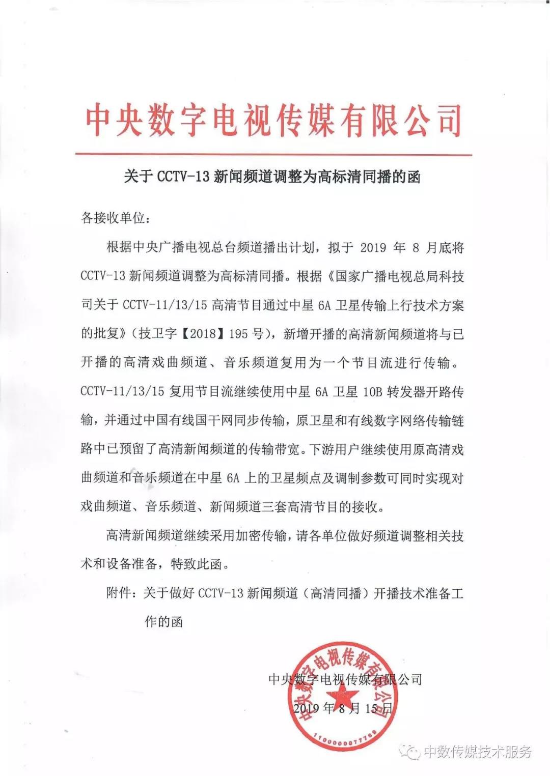 8月15日,中央数字电视传媒有限公司发布《关于CCTV-13新闻频道调整为高标清同播的函》,根据中央广播电视总台频道播出计划,拟于2019年8月底将CCTV-13新闻频道调整为高标清同播。